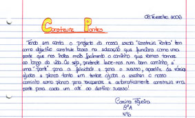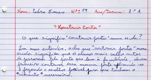 É criar objectivos, para os alunos aprenderem mais e melhor (Ricardo Vieira) É construir bases na educação (Jéssica) Pode significar acessibilidade, bem-estar entre alunos e professores, num melhor relacionamento (Mara) É construir o nosso futuro, o nosso caminho, para sermos alguém na vida. É a escola ajudar-nos (Andreia Pereira) Tem a ver com o respeito e a amizade. Significa que temos um caminho à nossa frente (Cristina) É fazer novas amizades com outras pessoas – professores, outras escolas, numa sadia competição – e com os funcionários. É também darmo-nos bem com pessoas de outros países, de outras religiões e culturas diferentes das nossas (Maria José Verdasca) É ter uma boa relação com os professores, os meus colegas, os funcionários, criando amizades. É também conhecer pessoas com hábitos, costumes e culturas diferentes (Neuza Calado) Deverá ser algo que se constrói para ultrapassar barreiras difíceis e ajudar os alunos a “passar para o outro lado”, de forma mais fácil (Rita Vieira) É estabelecer uma boa relação entre funcionários e alunos, e entre alunos e alunos. É “ligar” os professores aos alunos, construir laços de confiança e amizade entre professores e alunos e vice-versa (Laura Reis). É fazer uma ponte, mas não real, psicológica. Uma ponte que tenha bases fortes contra as tempestades da vida (Pedro Dias). Tem a ver com nós escolhermos os caminhos do nosso futuro, a começar pela área de estudos que queremos (Tiago Pereira). É renovar a vida, ajudar os que precisam, é transformar a vida das pessoas desanimadas, refazendo-a (Henrique Marto). Psicologicamente, construir pontes é construir a própria vida (Adriana). É criar uma espécie de passagem para a liberdade, mas não no sentido de fazermos tudo o que nos apetece: é também respeitar os outros (Adérito Reis) Significa a construção da nossa vida, o planeamento do nosso futuro – penso no caminho que irei seguir ao longo da vida (Alexandra Marto). Construir pontes é como construir uma vida (Cindy Santos) O projecto tem como objectivo ajudar-nos a construir o nosso futuro, ensinar-nos como devemos ser, pôr as bases da nossa vida (Ana Luísa Zagalo) É preocupar-se para que todos tenham um futuro melhor, com grande qualidade (Luís) É construir laços de amizade entre a família, a escola, os alunos e também os professores (Telmo Mota, Diogo Vieira) Não sei. Pode ser uma maneira para dizer outra coisa (Leandro) Creio que significa que a Escola vai tentar melhorar a educação dos alunos, fazer com que eles se apliquem e sejam responsáveis, mas de maneira mais simples e divertida (Jéssica Santos). É construir boas “bases” para o nosso futuro, evoluir nos métodos para não voltarmos à “estaca zero” (Célia Neves)