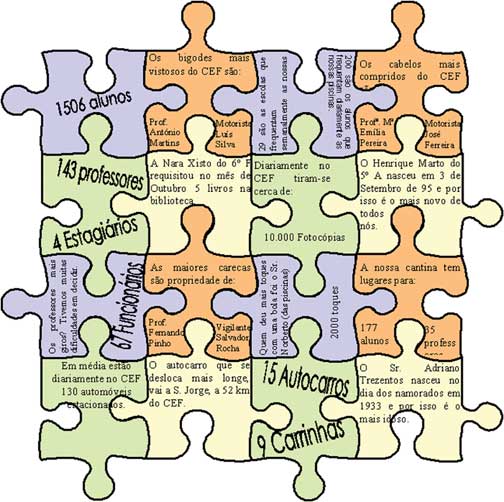 Os alunos da turma A do 7ºano elaboraram, no âmbito da disciplina de Projecto, uma lista com algumas curiosidades referentes à nossa escola. Estas são algumas "peças" do complexo puzzle de curiosidades, autênticos títulos de Guinness, que podes saber sobre a tua escola.